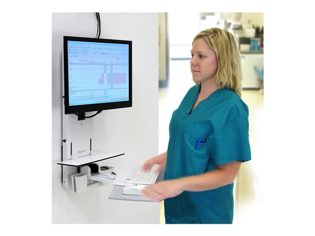 Déplacez l'ensemble du système d'un seul mouvement - le moniteur, le clavier, la souris et le lecteur. Le clavier coulissant qui s'incline vers l'arrière améliore le confort de l'utilisateur, tandis que le pivotement du moniteur et du clavier favorise l'interaction soignant-soigné.