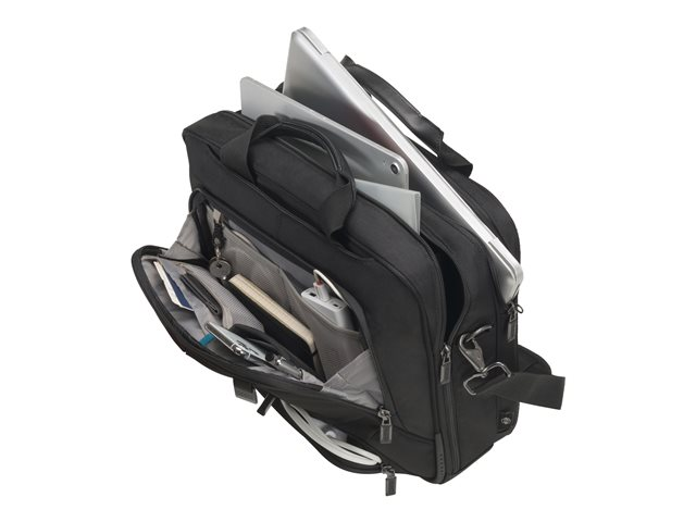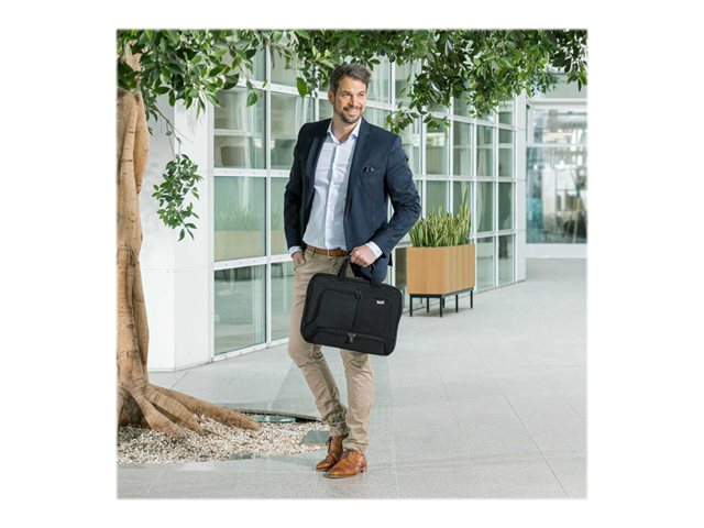 Avec l'Eco Top Traveller PRO, vous êtes un voyageur de " première classe ". La sacoche toploader vous accompagne partout et correspond aux exigences élevées en termes de qualité, de fonctionnalité et de protection. L'amour du détail de DICOTA fait de ce sac votre partenaire fiable! La séparation du système fit-all dans le compartiment ordinateur recouvre votre ordinateur, le protège et s'adapte automatiquement aux tailles 15-17,3". La mousse légère en EVA perforée placée dans le compartiment verrouillable de l'ordinateur, protège parfaitement les angles de votre appareil. Le revêtement de technologie antiglisse garantit une tenue optimale de votre ordinateur portable dans le compartiment et de la sangle rembourrée réglable en longueur. Protection idéale pour votre tablette de taille 12,9"dans le compartiment formé en EVA avec doublure extra douce en Nylex. Espace de rangement spacieux pour des documents. La poche frontale avec porte-clés et compartiments de rangement organise vos ustensiles personnels et offre de la place pour d'autres accessoires mobiles. Le compartiment à fermeture éclair convient pour papiers d'identité. Il y a un compartiment supplémentaire pour le bloc d'alimentation et le câble. Cette sacoche est légère et agréable à porter, grâce à ses poignées en cuir véritable de haute qualité. La lanière de fixation peut servir de compartiment supplémentaire pour des documents. Le fond du sac est en matière étanche. Cela fait de l'Eco Top Traveller PRO le sac parfait pour tous ceux qui se déplacent souvent et qui souhaitent soutenir la réutilisation raisonnable des bouteilles en PET grâce à une solution de transport écologique.