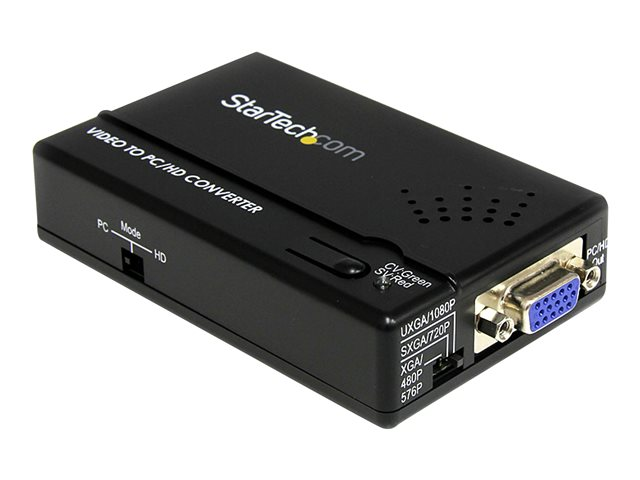 Le convertisseur de balayage composite et S-vidéo vers VGA (avec processeur de mise à l'échelle) VID2VGATV2 constitue un moyen simple de convertir des signaux composite ou S-vidéo en sortie VGA (ou RCA composant) pour qu'ils soient diffusés sur des écrans d'ordinateur, projecteurs ou téléviseurs HDTV. Equipé d'un menu avec affichage à l'écran et de commutateurs DIP pour une configuration et une sélection facilitées de vos réglages de sortie vidéo, ce processeur vidéo compact de mise à l'échelle s'installe rapidement et simplement pour une véritable expérience plug-and-play. Un circuit de mise à l'échelle intégré convertit le signal d'entrée S-vidéo ou composite de manière dynamique, vous permettant de choisir entre plusieurs résolutions de sortie pour une parfaite compatibilité avec votre écran ou projecteur. De plus, le convertisseur composant/S-vidéo-VGA comprend un câble de dérivation VGA vers composant (RCA), qui vous permet de le connecter à des téléviseurs non équipés d'un port VGA. Bénéficie de la garantie StarTech.com de 2 ans et de l'assistance technique à vie gratuite.