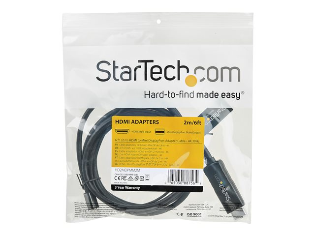 StarTech.com 6ft (2m) HDMI to Mini DisplayPort Cable 4K 30Hz, Active HDMI to mDP Adapter Converter Cable with Audio, USB Powered, Mac & Windows, HDMI Male to mDP Male Video Adapter Cable - HDMI to mDP Converter (HD2MDPMM2M) - Câble vidéo/audio - HDMI, USB (alimentation uniquement) mâle pour Mini DisplayPort mâle - 2 m - noir - support 4K HD2MDPMM2M