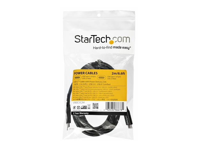 StarTech.com Câble USB-C vers USB-C avec Power Delivery 5A de 2 m - Cordon USB 2.0 Type-C certifié USB-IF - Blanc - Câble USB - 24 pin USB-C (M) droit pour 24 pin USB-C (M) droit - Thunderbolt 3 / USB 2.0 / USB 3.0 / USB 3.1 - 5 A - 2 m - noir