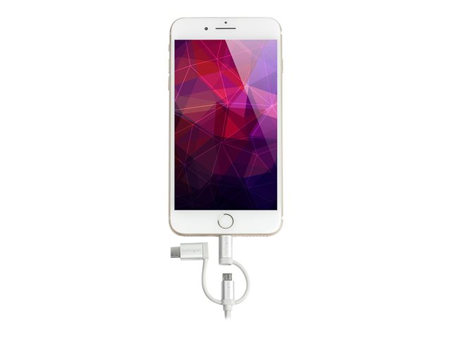 Pour charger ou synchroniser un appareil mobile USB-C ou Lightning, branchez simplement le connecteur correspondant au connecteur Micro-USB et branchez votre appareil. Pour charger ou synchroniser un appareil Micro-USB, branchez simplement le connecteur du milieu du câble à votre appareil mobile.