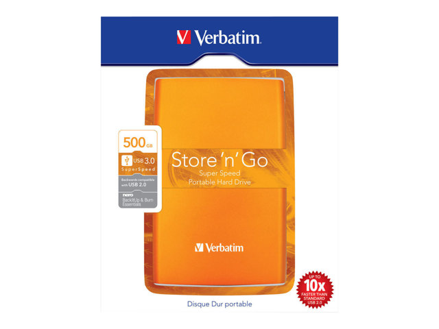Le disque dur portable Verbatim Store 'n' Go est une solution de stockage hautes performances qui utilise une interface USB 3.0 haute vitesse. La norme USB 3.0 permet d'atteindre des débits multipliés par 10 par rapport à l'USB 2.0 (sur la base de mesure de la vitesse de bus USB), vous offrant un taux de transfert de données ultra-rapide.