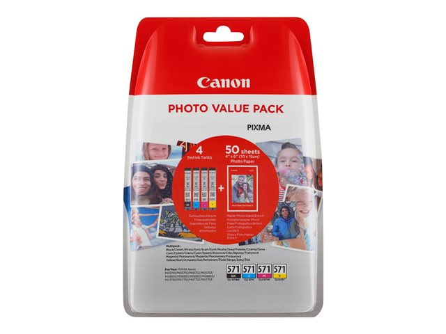 Canon CLI-571 C/M/Y/BK Photo Value Pack - Pack de 4 - 7 ml - noir, jaune, cyan, magenta - original - 100 x 150 mm 50 feuille(s) réservoir d'encre/kit papiers - pour PIXMA TS5051, TS5053, TS5055, TS6050, TS6051, TS6052, TS8051, TS8052, TS9050, TS9055 0386C006