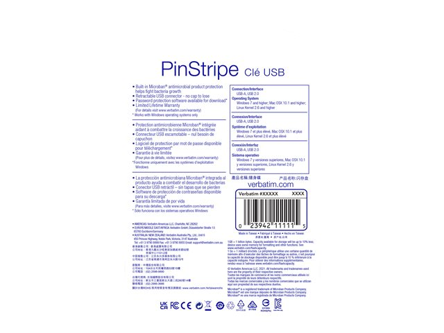 La clé USB PinStripe de Verbatim est rétractable, ce qui protège la connexion USB lorsqu'elle n'est pas utilisée, sans nécessiter de capuchon, qui se perd facilement.