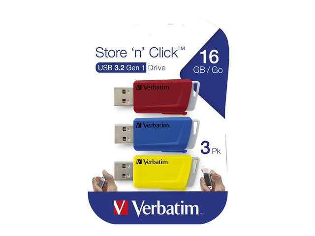 Verbatim Store 'n' Click - Clé USB - 16 Go - USB 3.2 Gen 1 - bleu, jaune, rouge (pack de 3) 49306