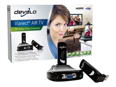 Profiter des contenus multimédia de l'ordinateur portable, du netbook ou du PC en qualité très simplement et sans câbles sur un grand téléviseur: avec devolo Vianect AIR TV, vous établissez une connexion entre votre ordinateur et votre téléviseur ou un projecteur en un tournemain. Montrez vos images et vos vidéos à des amis et à la famille, regardez les contenus multimédia des plates-formes vidéo et des médiathèques dans la bonne taille! Absolument sans câble grâce à la technologie USB sans fil.