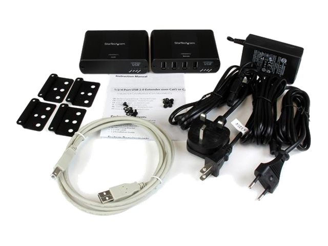 L'extendeur USB 4 ports USB2004EXT2 vous permet de prolonger jusqu'à 100 m les connexions des appareils USB 2.0 sur câble Ethernet Cat5 ou supérieur. Un adaptateur d'alimentation inclus à l'extrémité distante fournit jusqu'à 500 mA par port, vous permettant ainsi d'accéder à et d'alimenter quatre appareils USB 2.0 distants du système informatique hôte.