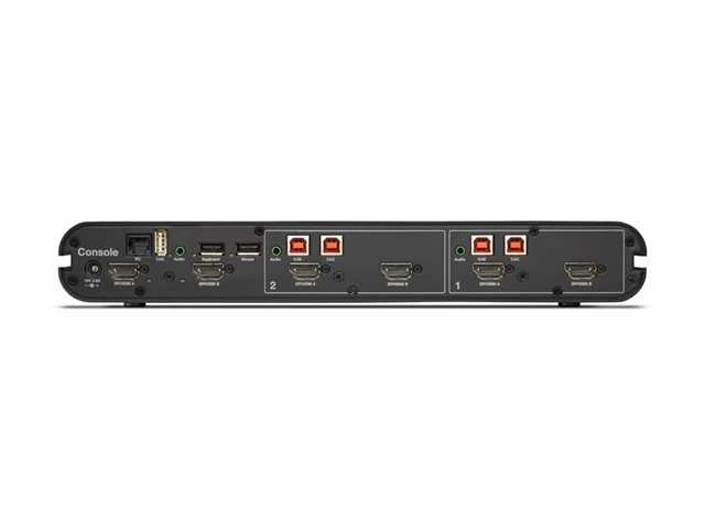| Interfaces | 4 x entrée DisplayPort/HDMI 2 x sortie DisplayPort/HDMI 2 x clavier (USB) / souris (USB) Type B 1 x clavier (USB) Type A 1 x souris (USB) Type A 1 x sortie audio mini-jack 2 x entrée audio mini-jack 2 x USB 2.0 Type B common access card (CAC) 1 x USB 2.0 Type A common access card (CAC) 1 x gestion RJ-14 |
