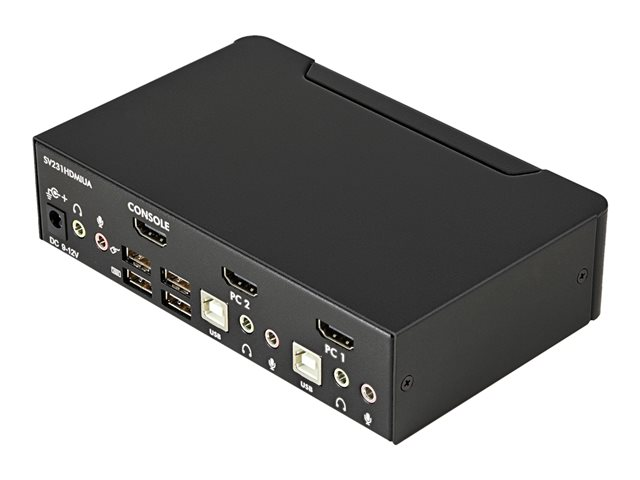 Le commutateur 2 ports USB HDMI SV231HDMIUA vous permet de contrôler deux ordinateurs ou périphériques compatibles USB et dotés d'interfaces vidéo HDMI, à l'aide d'une seule console ou d'un ensemble de périphériques (clavier, souris, moniteur, haut-parleurs et microphones USB). Le commutateur USB HDMI KVM est une solution KVM véritablement polyvalente, il est doté d'un concentrateur USB 2 ports intégrés qui permet à certains ordinateurs d'accéder à des périphériques USB haute vitesse partagés, supprimant ainsi le coût engendré par des achats supplémentaires de périphériques USB. Garantissant une capacité vidéo de haute qualité, le commutateur HDMI KVM prend en charge des résolutions HD d'au plus 1920 x 1200. Ce commutateur offre une excellente transmission du signal numérique, il peut être utilisé pour partager un panneau HD entre plusieurs sources HDMI, telles que les lecteurs Blu-Ray, les consoles de jeux vidéo et les médiathèques HD. Le commutateur prend également en charge les fonctions de commutation audio et microphone et vous permet de sélectionner des ordinateurs connectés, des ports du concentrateur du périphérique USB et des canaux audio et micro, de manière simultanée ou indépendante, à l'aide des boutons-poussoir du panneau avant ou des touches de raccourci du clavier. Bénéficie de la garantie StarTech.com de 3 ans et de l'assistance technique gratuite à vie.