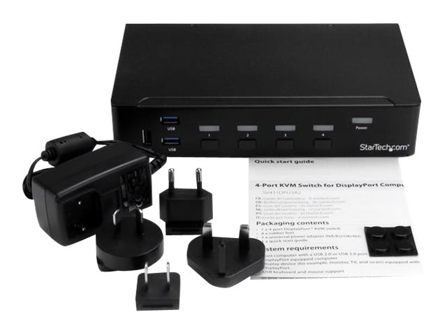 Ce commutateur KVM USB 3.0 DisplayPort à 4 ports vous permet de contrôler quatre ordinateurs DisplayPort (DP) avec un seul jeu de clavier, souris et moniteur. Le KVM comporte aussi l'audio 3,5 mm et un hub USB 3.0 à 3 ports intégré.